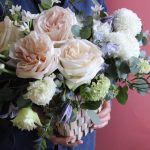 Хризантема – 2 шт.Роза пионовидная – 5 шт.Клематис – 2 шт.Нарцисс – 3 шт.Лизиантус – 3 шт.Вибурнум – 2 шт.Эвкалипт – 5 шт.Лукошко – 1 шт.Оазис флористический – 1 шт.