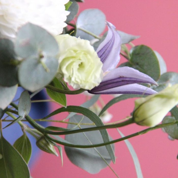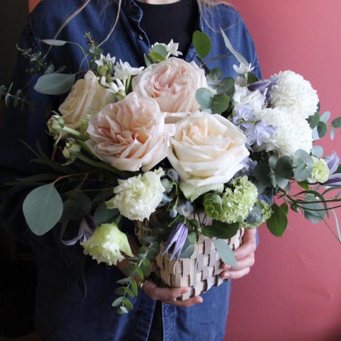 Хризантема – 2 шт.Роза пионовидная – 5 шт.Клематис – 2 шт.Нарцисс – 3 шт.Лизиантус – 3 шт.Вибурнум – 2 шт.Эвкалипт – 5 шт.Лукошко – 1 шт.Оазис флористический – 1 шт.