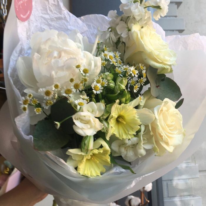 Пион – 1 шт.нарциссы – 2 шт.Роза – 2 шт.Альстромерия – 1 шт.Маттиола – 1 шт.Танацетум – 2 шт.Фрезия – 2 шт.Зелень – 1 шт.Упаковка дизайнерская – 1 шт.