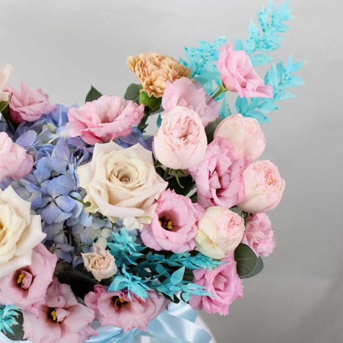 Эвкалипт – 8 шт.Гвоздика – 2 шт.Лента атласная – 1 шт.Коробка шляпная – 1 шт.Гортензия голубая – 1 шт.эустома розовая – 3 шт.Маттиола белая – 2 шт.Роза одноголовая мента – 3 шт.Губка флористическая – 1 шт.рускус стабилизированный – 4 шт.роза кустовая пионовидная мэнсфилд – 1 шт.