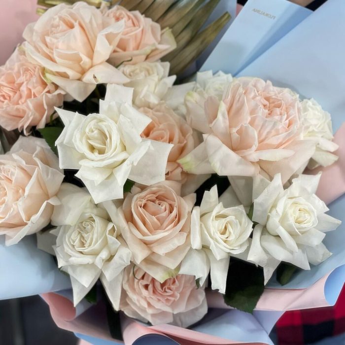 Роза Эквадор – 7 шт.Лента атласная – 2 шт.Фисташка – 3 шт.Роза пионовидная – 8 шт.Упаковка дизайнерская – 6 шт.чико крашенная – 2 шт.