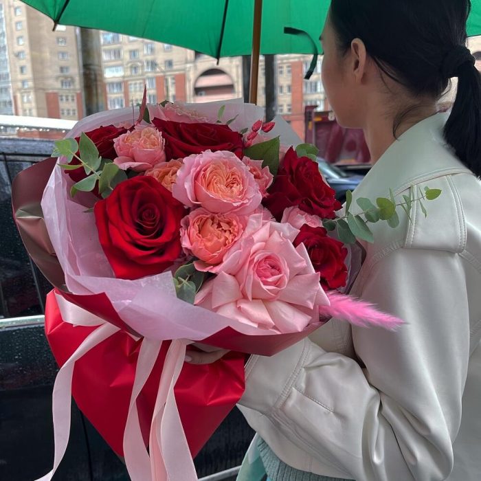 Лента атласная – 2 шт.Тишью – 4 шт.Пионовидная роза – 2 шт.Салал листья – 4 шт.Сухоцвет – 5 шт.Пленка матовая – 4 шт.красная роза 60 см – 5 шт.white o’hara – 1 шт.