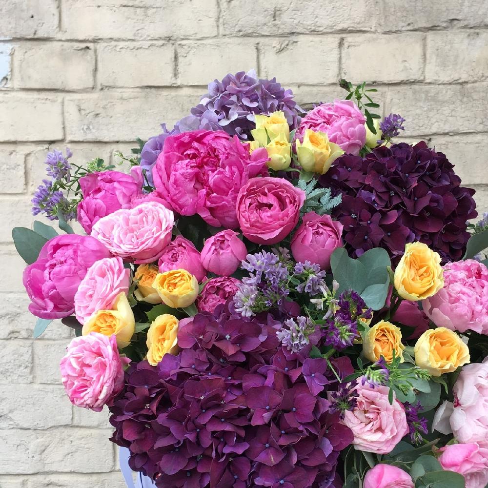 Твой сад - Корзина с пионами, сиренью и пионовидными розами