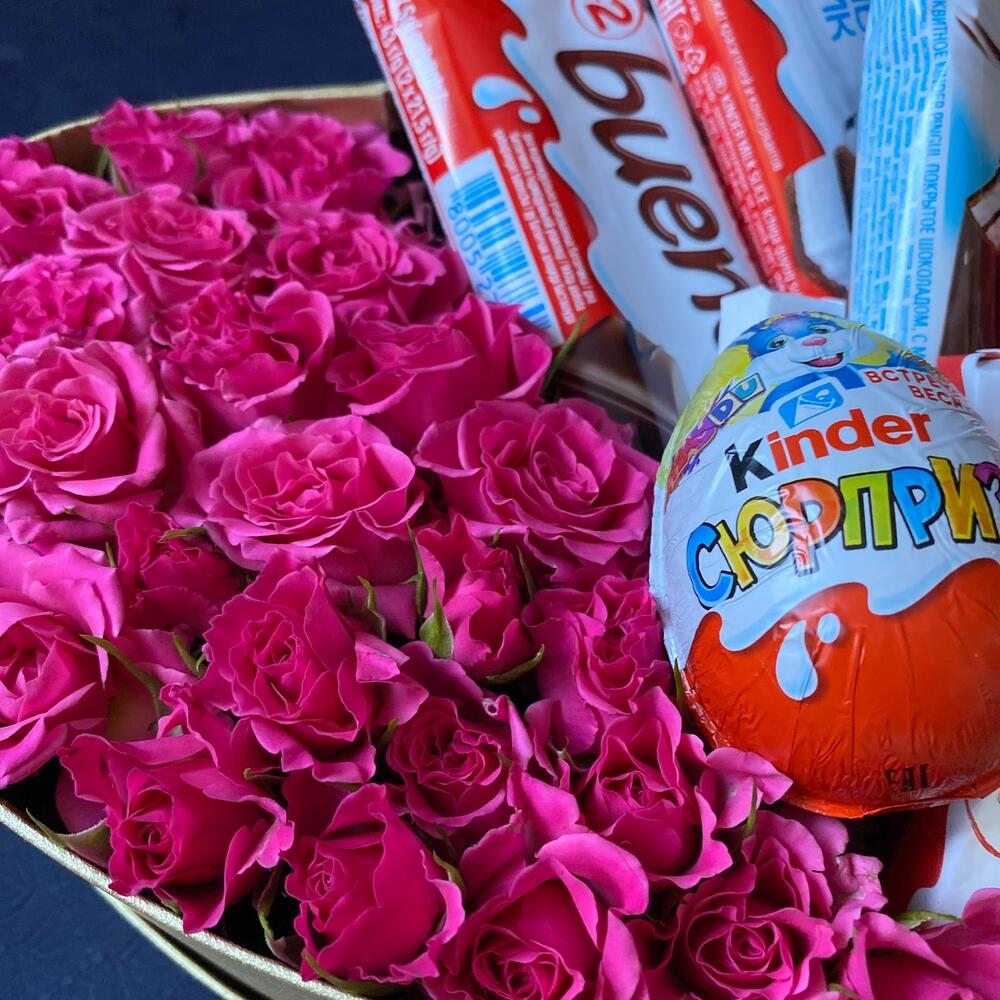 Роза кустовая розовая – 15 шт.Коробка – 1 шт.Киндер пингви – 1 шт.Kinder bueno – 1 шт.Kinder сюрприз – 1 шт.Kinder chocolate – 4 шт.Киндер молочный ломтик – 1 шт.