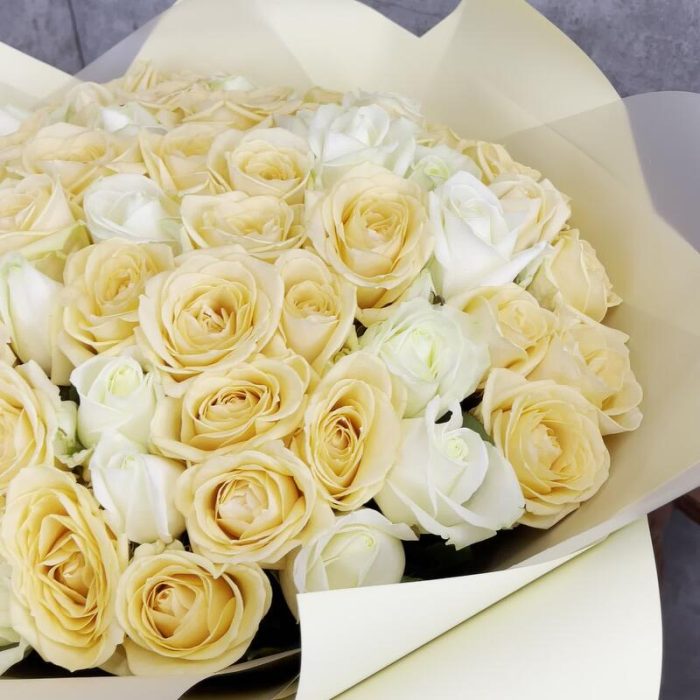 Букет 51 шт. из элитных белых и персиковых роз