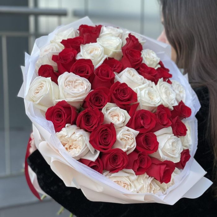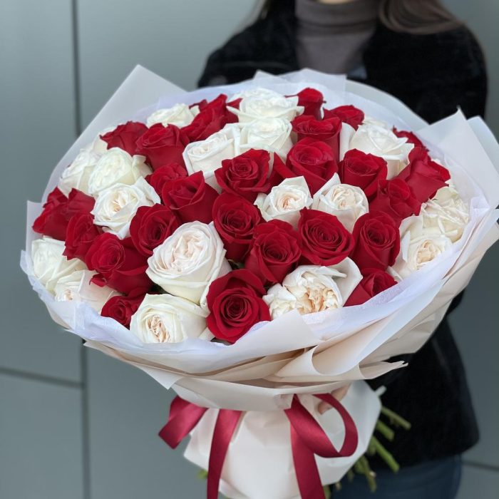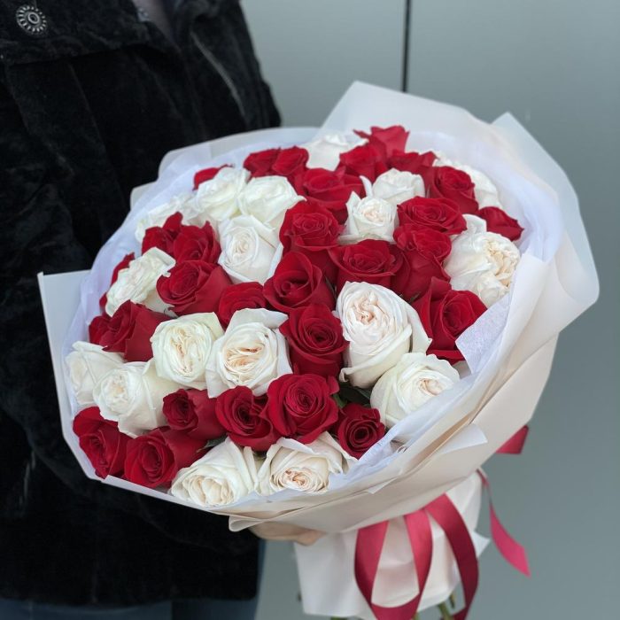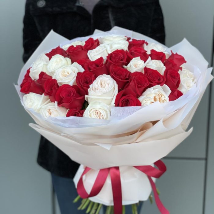 роза красная freedom – 31 шт. роза ohara – 20 шт. Оформление – 1 шт.