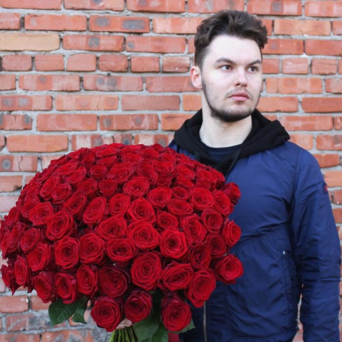 Лента атласная – 1 шт.Роза красная 60 см – 101 шт.