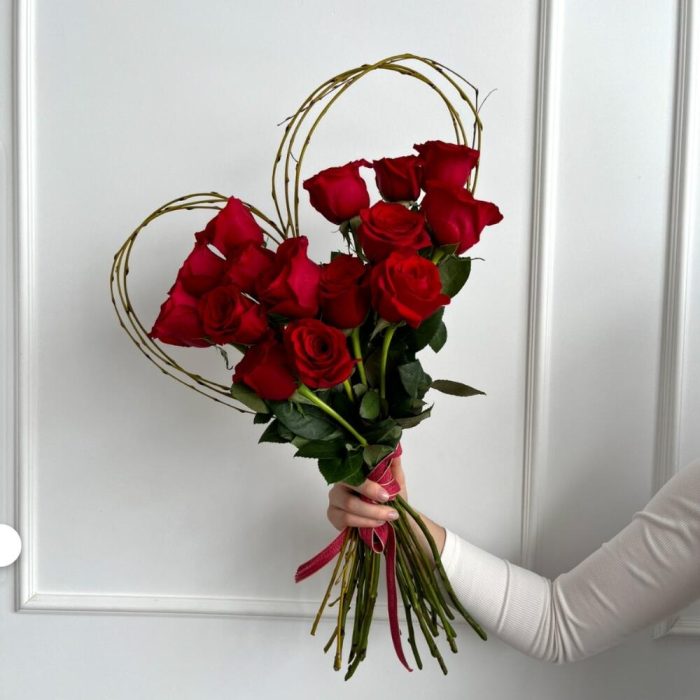 Лента – 1 шт. Роза красная – 15 шт. ветки декоративные – 6 шт.