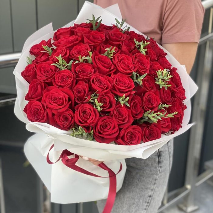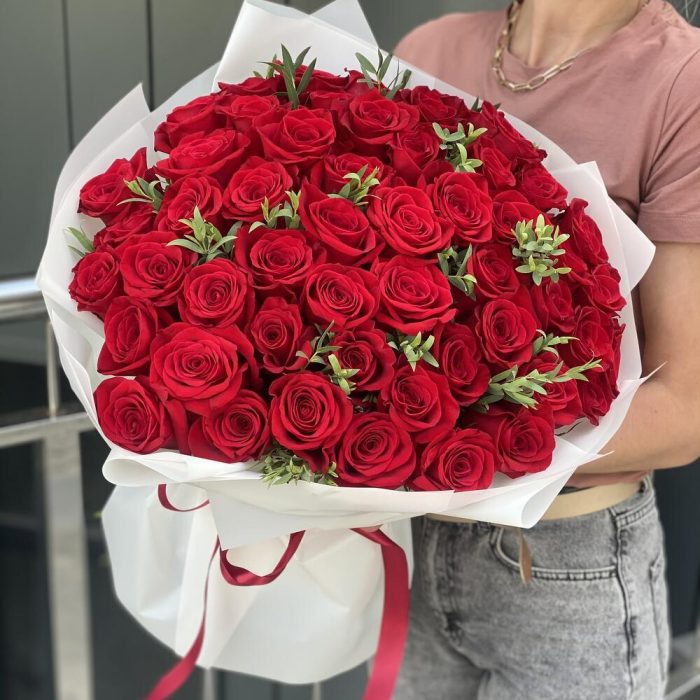 Эвкалипт – 3 шт. Оформление – 1 шт. роза красная фридом – 51 шт.