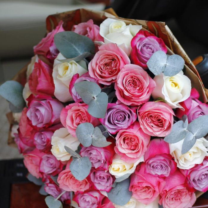 Прекрасный, объемный и стильный букет из 51 разноцветной розы выполненный в нежных оттенках роз, с добавлением зелени эвкалипта и упакованный в бумагу крафт.