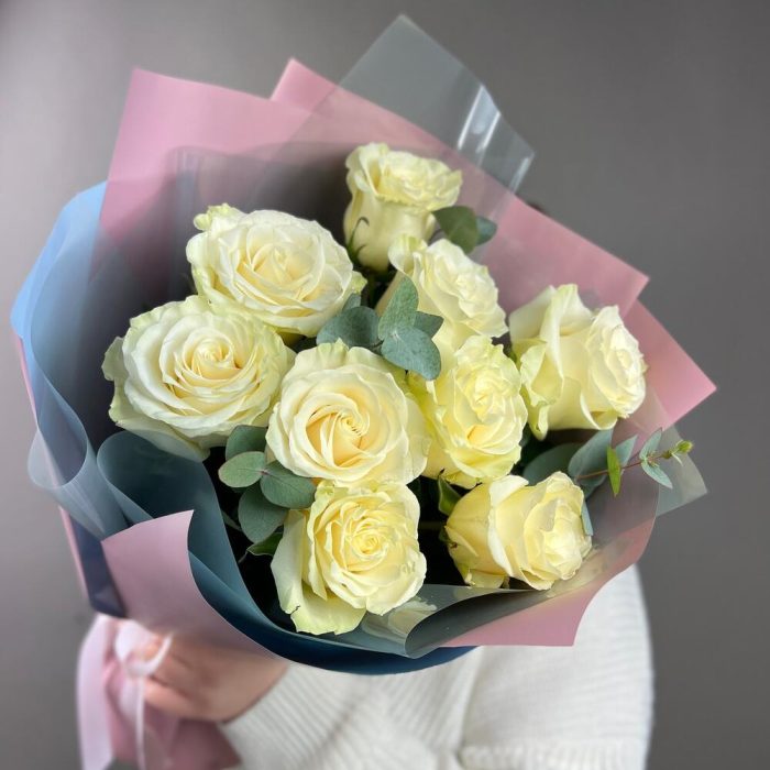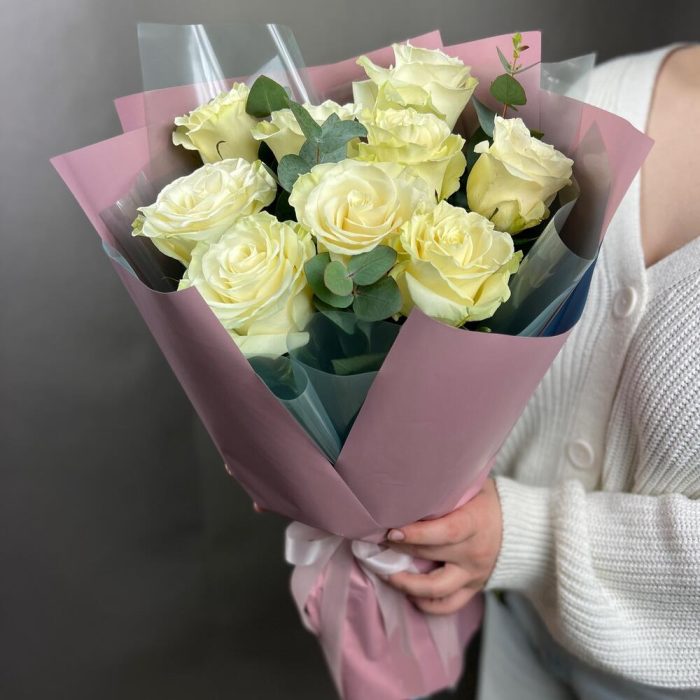 Эвкалипт – 3 шт.Лента атласная – 2 шт.Пленка матовая – 5 шт.Роза мондиаль 50 см – 9 шт.пленка полупрозрачная – 4 шт.