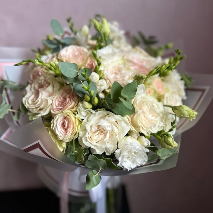 Пионовидная роза – 11 шт.Фрезия – 13 шт.Кустовая роза – 7 шт.Эвкалипт – 3 шт.декоративная упаковка – 1 шт.Атласная лента – 1 шт.