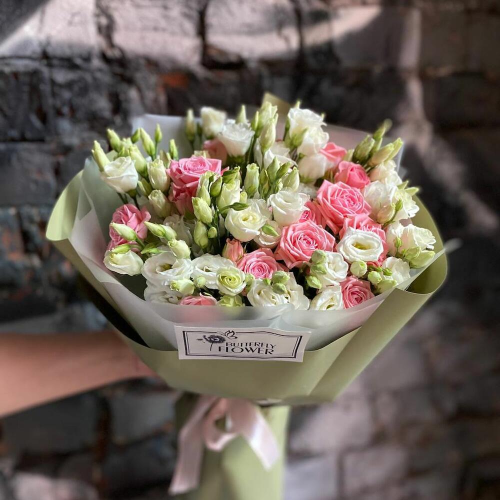 Букет из белой эустомы и кустовой пионовидной розы в дизайнерской упаковке “Бомбастик”