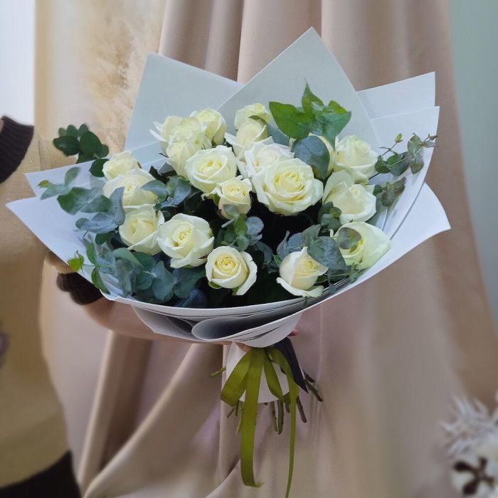 Букет из белых роз и эвкалипта