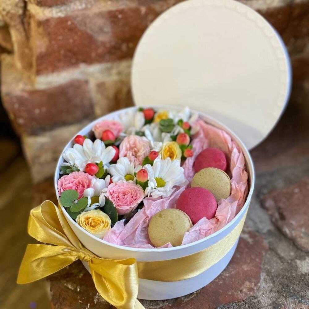 Букет из цветов и макаронс в декоративной коробке “Карамель”
