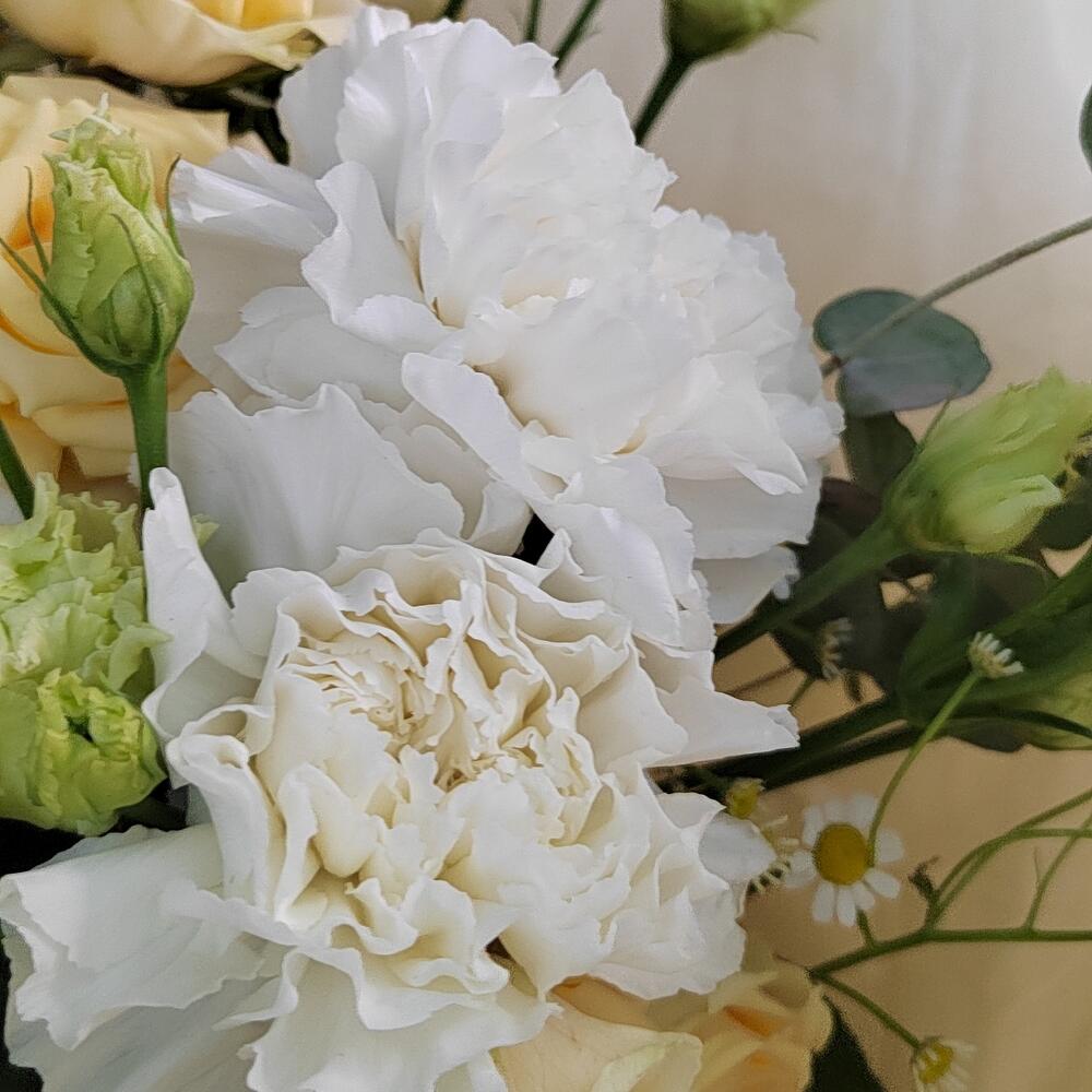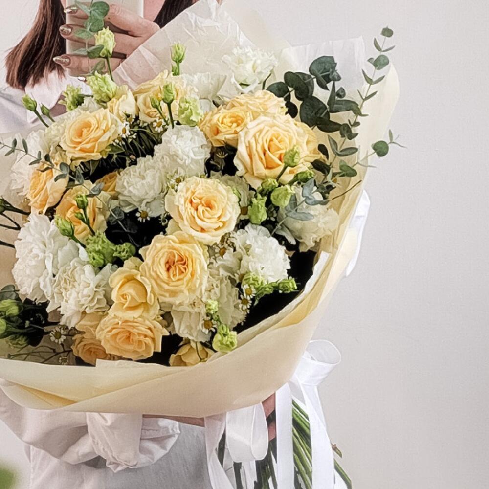 Кремовый моно букет из гвоздик и эвкалипта