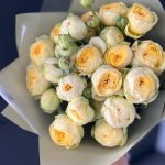 желтые пионовидные кустовые розы 60 см в дизайнерской упаковке – 7 шт. Дизайнерская упаковка – 1 шт. Открыточка с вашими пожеланиями – 1 шт. доставка – 1 шт.