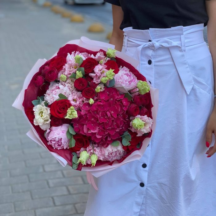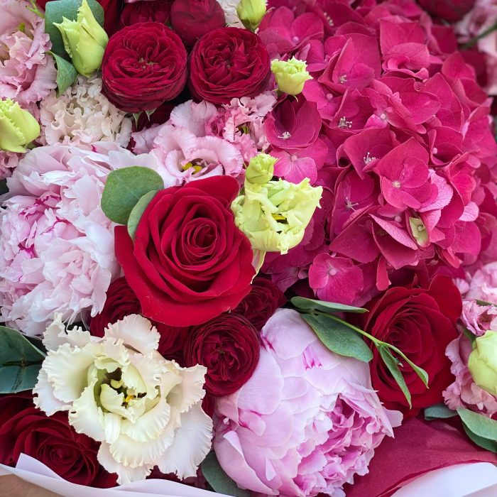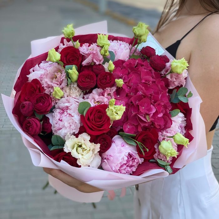 Твой сад - Корзина с пионами, сиренью и пионовидными розами