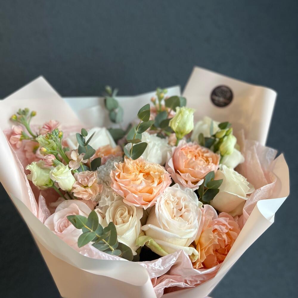 Кустовая пионовидная роза – 1 шт.одноголовая пионовидная роза – 3 шт.Маттиола – 2 шт.Лизиантус – 2 шт.Одноголовая роза – 3 шт.Эвкалипт – 7 шт.декоративная упаковка – 1 шт.Атласная лента – 1 шт.