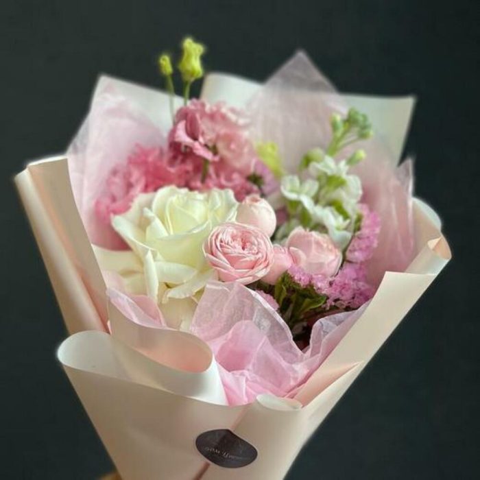 Маттиола – 1 шт.Статица – 1 шт.Кустовая пионовидная роза – 1 шт.Одноголовая роза – 1 шт.декоративная упаковка – 1 шт.Атласная лента – 1 шт.
