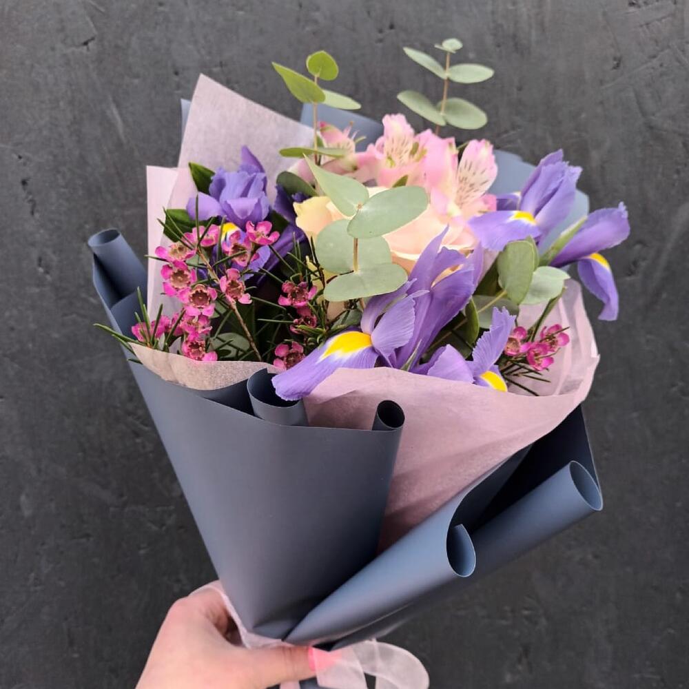 Ирис – 3 шт.Роза – 1 шт.Альстромерия – 1 шт.Ваксфлауэр – 1 шт.Эвкалипт – 5 шт.Упаковка дизайнерская – 2 шт.Лента атласная – 1 шт.