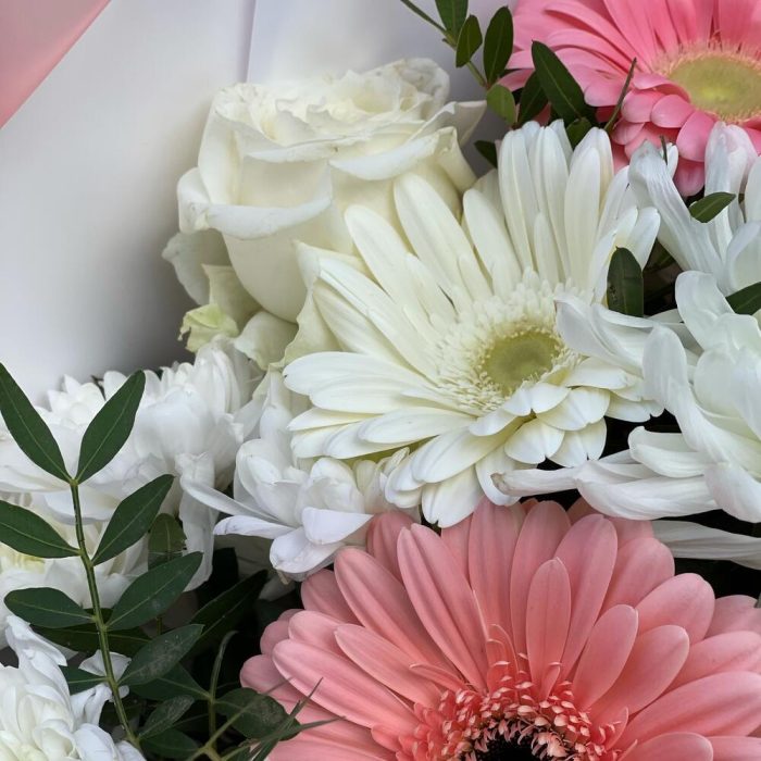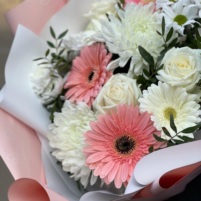 Гербера – 5 шт.Одноголовая хризантема – 2 шт.Кустовая хризантема – 2 шт.Роза – 3 шт.Фисташка пучок – 1 шт.Бумага – 1 шт.Лента – 1 шт.