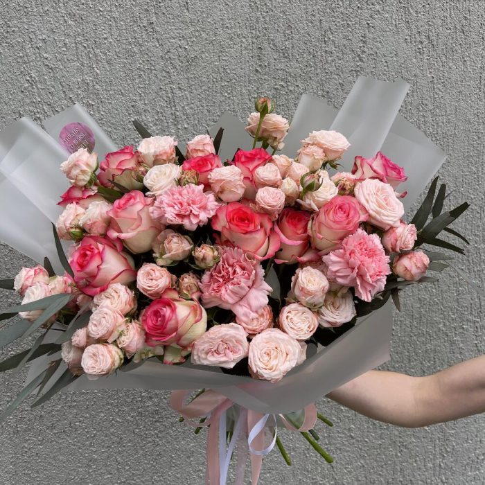 Диантусы, в свою очередь, придают букету дополнительное очарование.
