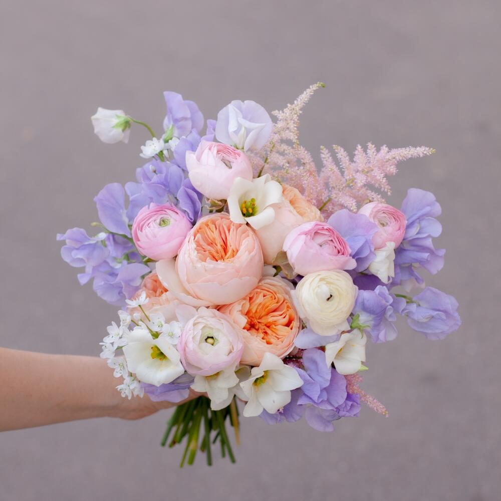 Латирус – 10 шт.Роза Джульетта – 5 шт.Астильба – 3 шт.Ранункулюс розовый – 6 шт.сумка переноска – 1 шт.Ваза – 1 шт.Лизиантус – 1 шт.
