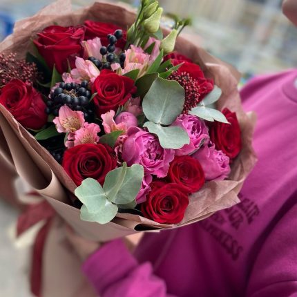 Кустовая пионовидная роза – 6 шт. роза одноголовая pink mondial – 3 шт. Эвкалипт – 2 шт. Оформление – 1 шт.