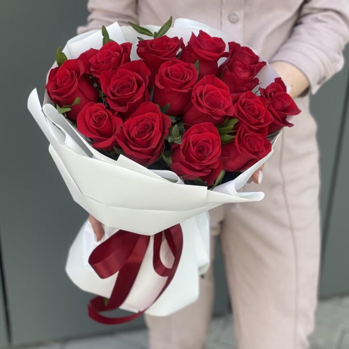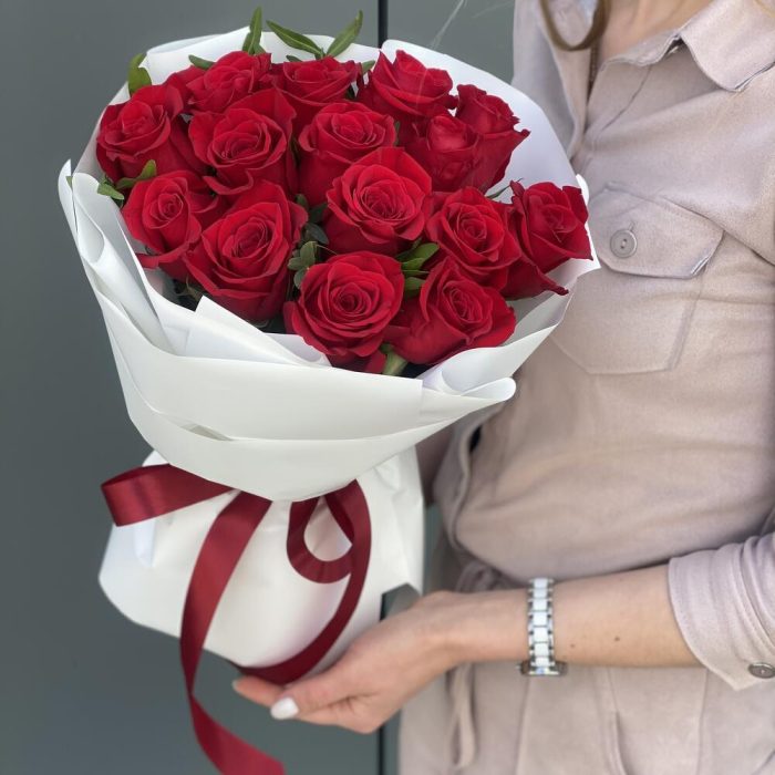 Роза Freedom – 15 шт. Эвкалипт парфиволия – 2 шт. Оформление – 1 шт.