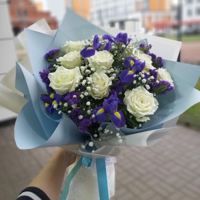 Лента – 2 шт.Статица – 1 шт.Ирис Blue Magic – 5 шт.Пленка матовая – 2 шт.Гипсофила Мирабелла 95 г – 1 шт.роза кения 50 см – 9 шт.