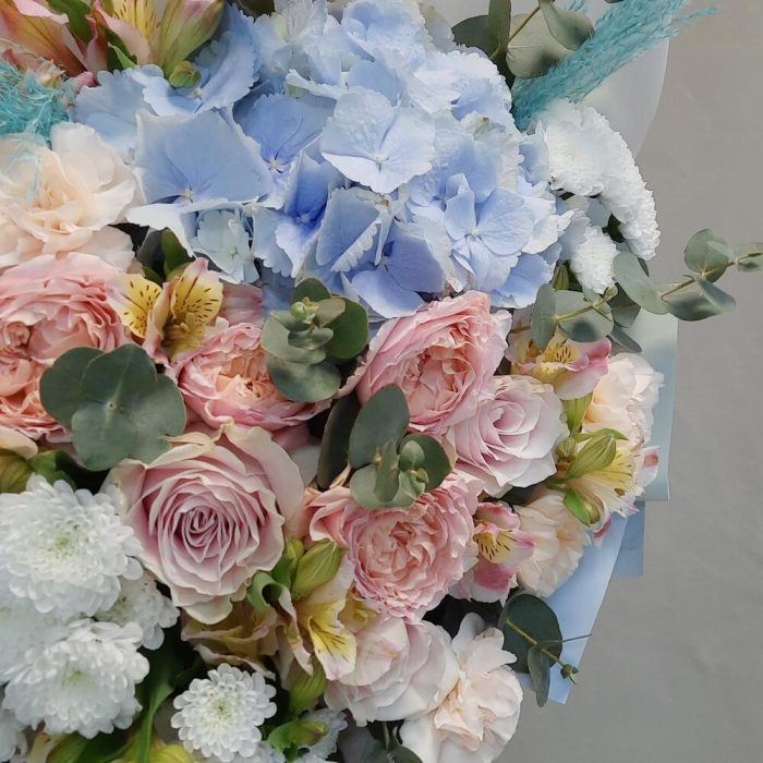 Гортензия – 1 шт.Роза – 3 шт.Роза кустовая пионовидная – 1 шт.Диантус – 5 шт.Альстромерия – 3 шт.Сантини – 3 шт.Эвкалипт – 4 шт.ветки декоративные – 2 шт.Рускус – 15 шт.Упаковка дизайнерская – 3 шт.Лента атласная – 1 шт.