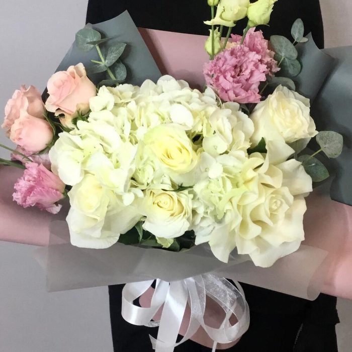 Букет с гортензией, розой Мондиаль и эустомой “Нежные нотки”