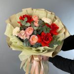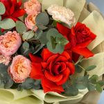 Маттиола – 1 шт.Роза кустовая – 2 шт.Эвкалипт – 2 шт.Роза одноголовая – 3 шт.Гвоздика – 2 шт.Лента атласная – 2 шт.Фисташка – 3 шт.Упаковка дизайнерская – 2 шт.
