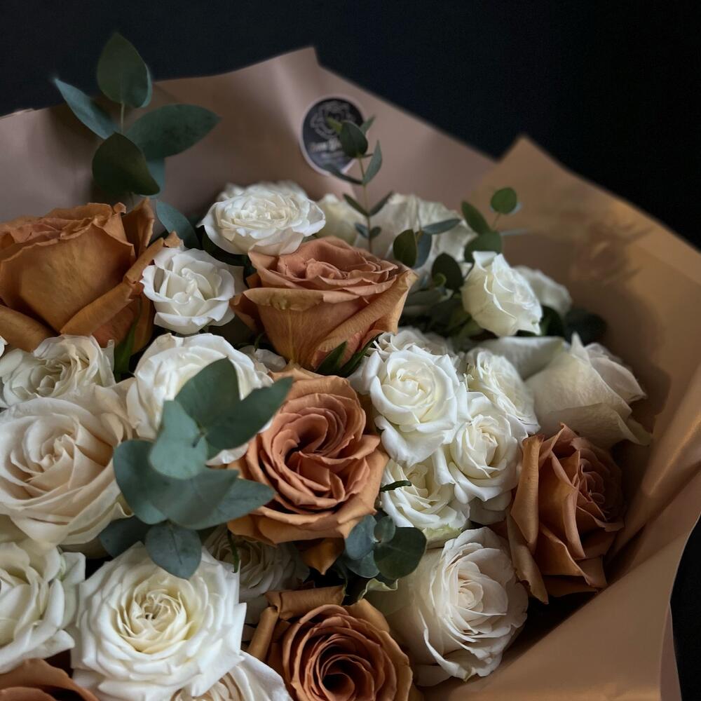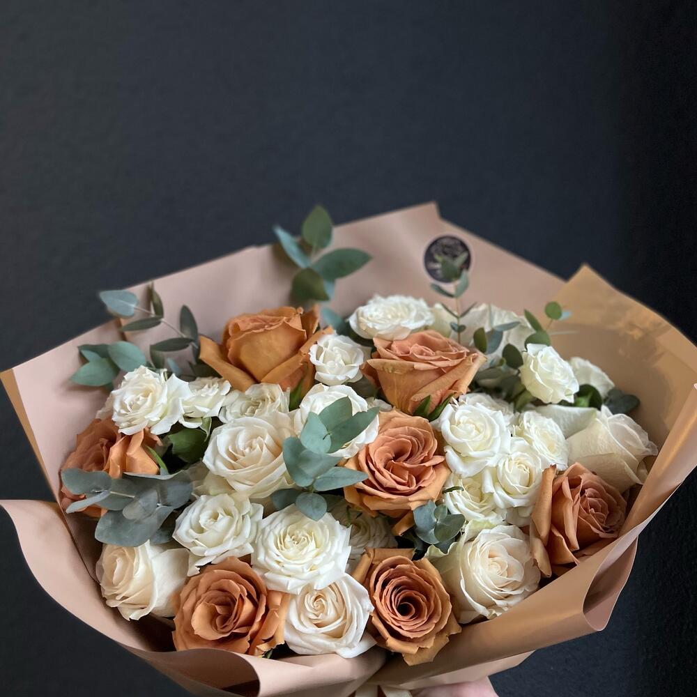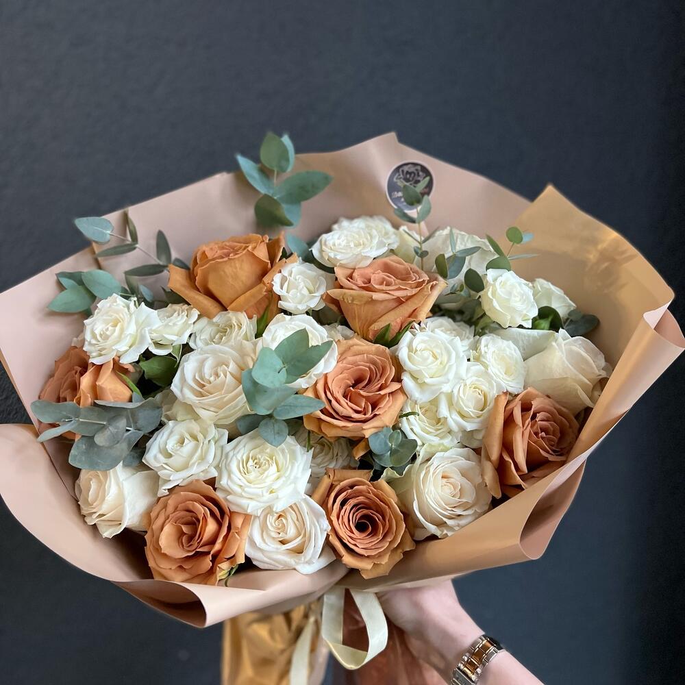 Одноголовая роза – 6 шт.Кустовая роза – 6 шт.роза тоффи – 7 шт.Эвкалипт – 8 шт.декоративная упаковка – 1 шт.Атласная лента – 1 шт.