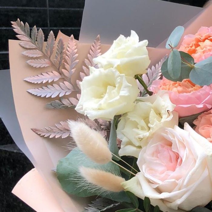Роза кустовая джульетта – 1 шт.Маттиола белая – 2 шт.Лизиантус Алиса белый – 2 шт.Эвкалипт – 1 шт.Диантус – 3 шт.