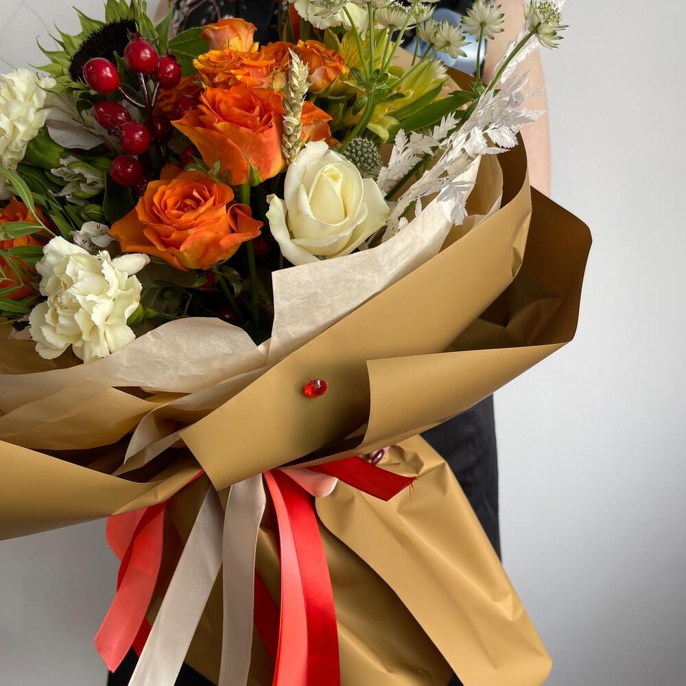 Подсолнух – 1 шт.Диантус – 3 шт.Альстромерия – 2 шт.Кустовая роза – 2 шт.Роза Россия – 5 шт.Астранция – 1 шт.Ягоды декоративные – 1 шт.Папоротник – 1 шт.Фисташка пучок – 1 шт.Пленка матовая – 6 шт.Лента атласная – 2 шт.