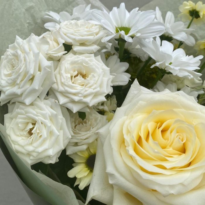 роза сорта кендилайт – 1 шт.Хризантема кустовая – 1 шт.Роза кустовая белая – 2 шт.Хризантема Сантини – 2 шт.