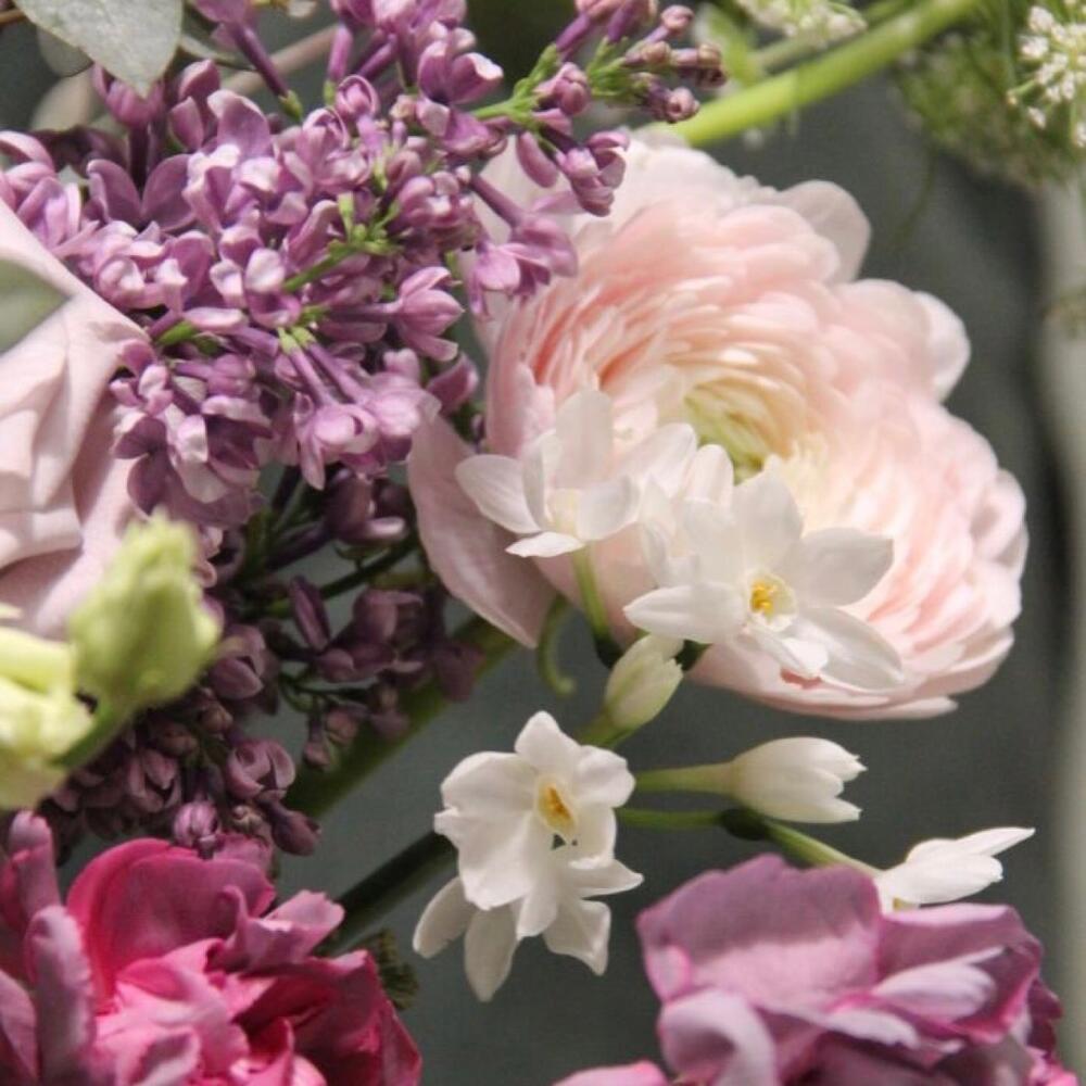 Тюльпан сортовой – 3 шт.Сирень – 3 шт.Нарцисс кустовой – 3 шт.Ранункулюс (лютик) – 5 шт.Роза сортовая – 3 шт.Лизиантус – 5 шт.Гвоздика – 3 шт.Амми – 4 шт.Колючка – 1 шт.Эвкалипт – 9 шт.Лента – 1 шт.