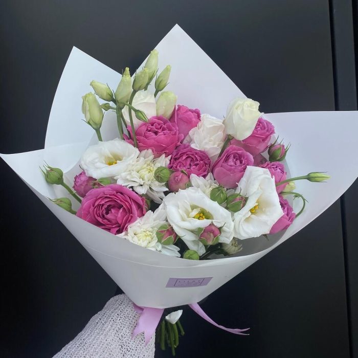 Упаковка дизайнерская – 1 шт. Открыточка с вашими пожеланиями – 1 шт. эустома белая – 3 шт. Misty Bubbles пионовидная роза – 5 шт.