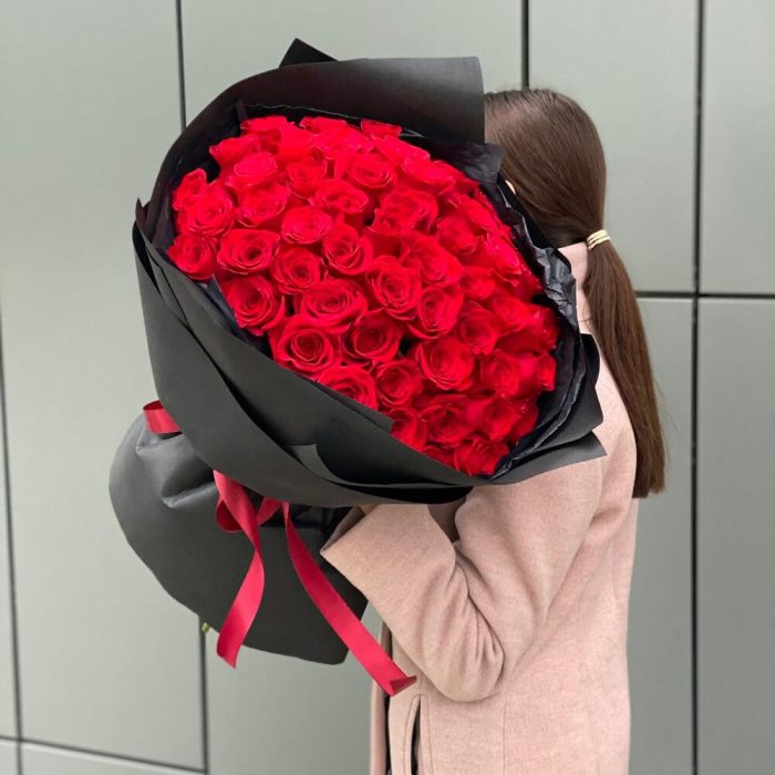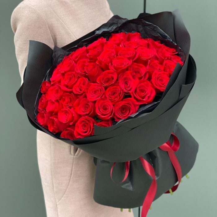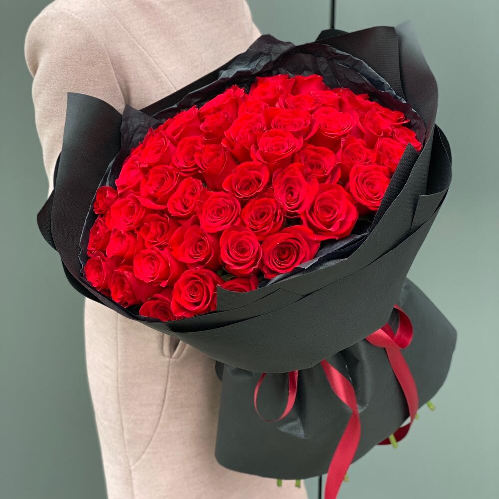 Букет из 51 красной розы в черном стильном оформлении!