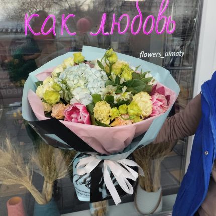 Гвоздики, Лизиантусы, Розы, Тюльпаны