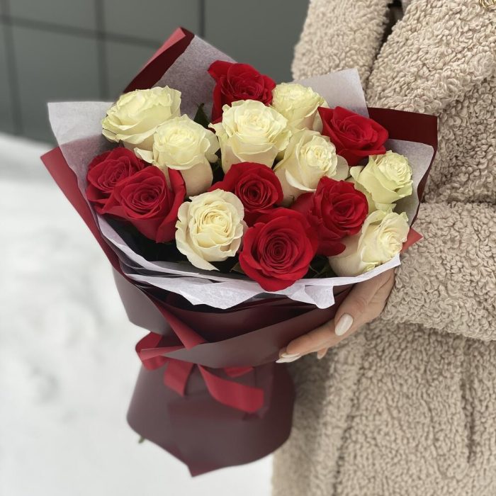 Букет Влюбленный взгляд из 15 красных и белых роз в оформлении