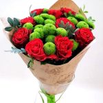 роза красная эль торо – 9 шт. Хризантема кустовая зеленая – 4 шт. зелень фисташка – 2 шт. оформление бумага – 1 шт.