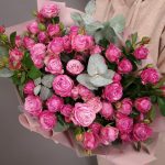 Пионовидная кустовая роза – 15 шт. Эвкалипт – 5 шт. Упаковка дизайнерская – 3 шт. Аквабокс – 1 шт.