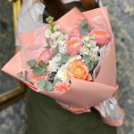 Роза кустовая пионовидная джульетта – 1 шт.Маттиола – 2 шт.Хризантема кустовая – 1 шт.Роза пионовидная кахала – 1 шт.Диантус – 3 шт.Эвкалипт – 3 шт.Тишью белое – 2 шт.Пленка матовая – 5 шт.Лента атласная – 2 шт.