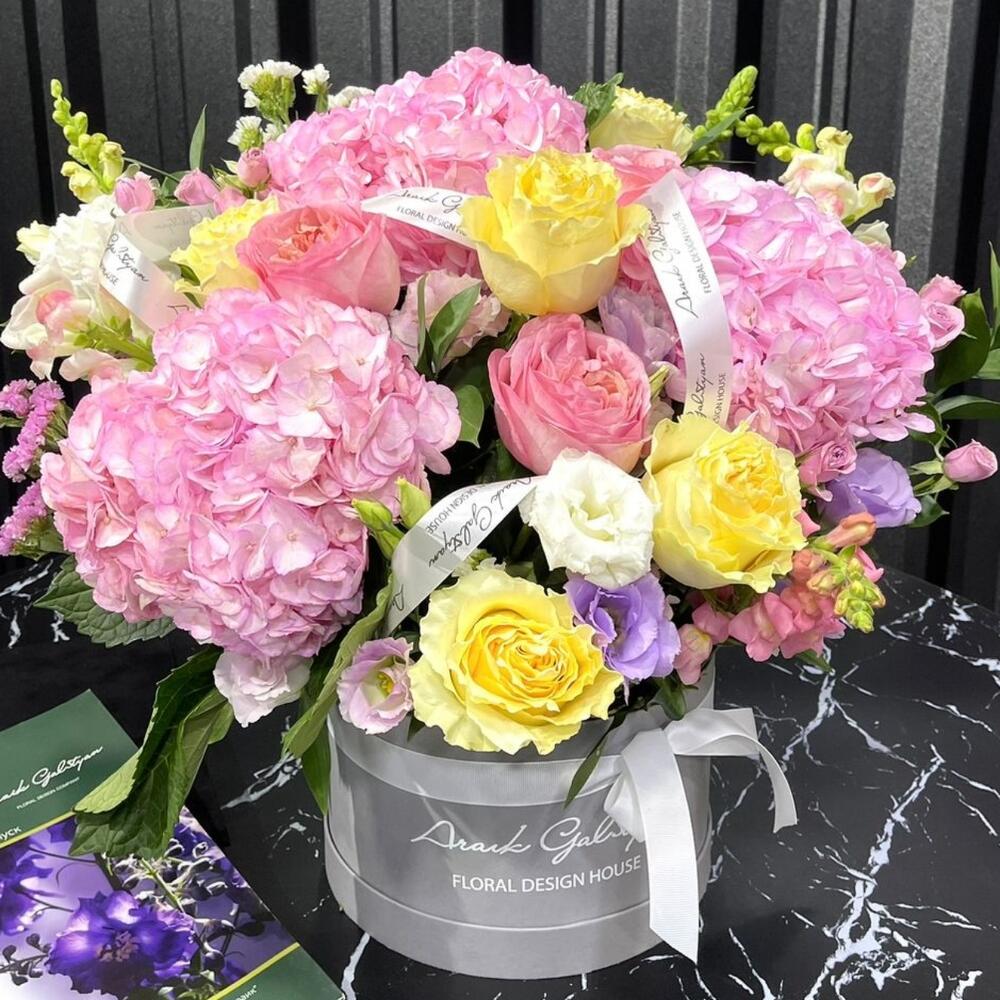 Нежная, зефирная, пушистая коробка с гортензиями и розами обрадует любую. А лизиантусы придадут дню хорошее настроение и позитивный день.