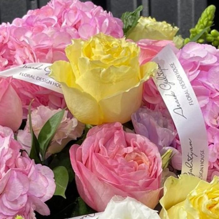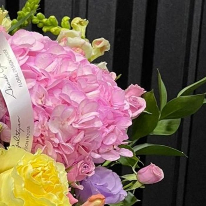 зелень альстромерия – 3 шт. Роза – 8 шт. Гортензия розовая – 3 шт. Лизиантус – 4 шт. Львиный зев – 5 шт. Статица – 3 шт. Роза кустовая – 2 шт. Рускус – 7 шт.