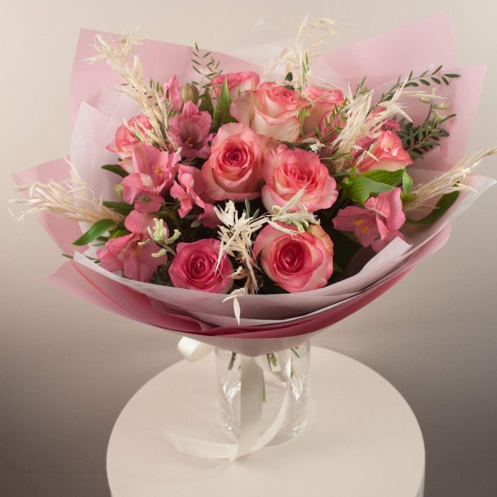 Роза – 9 шт. Альстромерия – 3 шт. Овес – 1 шт. Оформление – 1 шт.