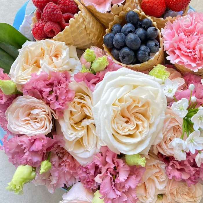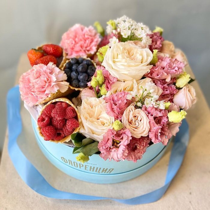 Лента атласная – 1 шт.Упаковка пленка – 1 шт.эустома розовая – 4 шт.Пионовидная роза кустовая – 3 шт.Оазис флористический – 1 шт.фисташка зелень – 3 шт.коробка шляпная брендированная – 1 шт.Клубника – 50 гр.рожки вафельные – 5 шт.аллиум белый (мини) – 2 шт.пионоивдная роза ароматная – 3 шт.даинутс – 3 шт.Голубика – 50 гр.Малина – 50 гр.